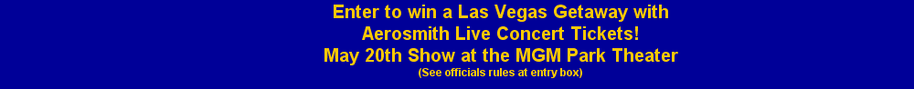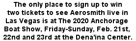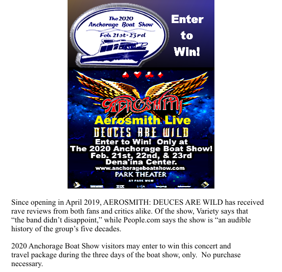 Official Rules Random drawing, Monday, Feb. 22nd. Winners will be announced on facebook and contacted by mail. If the winner does not respond within 48 hours, then another winner will be selected. To enter you must be at least 18 years of age. Only those not affiliated with the Anchorage Boat Show, our sponsors and affiliates may enter. Winner must be able to travel to Las Vegas to attend the May 20th, Aerosmith concert at the Park Theater. Air travel and accommodations are included. No Cash Value. If winner is unable to travel or attend, they may assign the prize to another, however they may not assign travel to a minor under the age of 18. All concert and travbel materials used by permission. |
